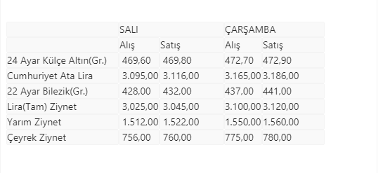İstanbul Kapalıçarşı'da alınıp satılan altın türlerinin, önceki kapanış ve bugün açılış fiyatları (TL) şöyle: