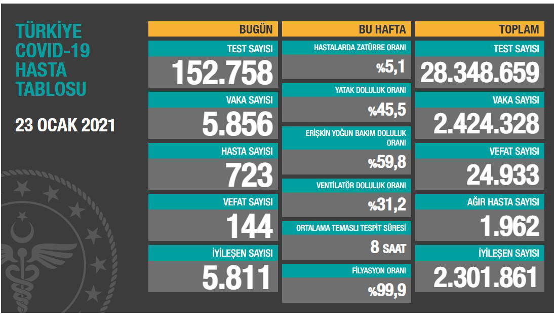 Buna göre, son 24 saatte 152 bin 758 Covid-19 testi yapıldı, 5 bin 856 kişinin Covid-19 testi pozitif çıktı, 144 kişi hayatını kaybetti. Hasta sayısı 723 olarak açıklandı.