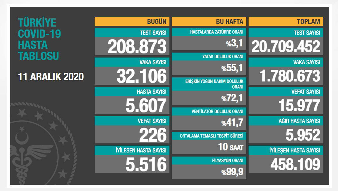Bugün 32 bin 106 kişi koronavişrüse yakalanırken 226 yurttaş salgın nedeniyle yaşamını yitirdi.
