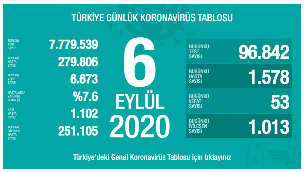 Türkiye'nin 6 Eylül 2020 koronavirüs tablosu şöyle: