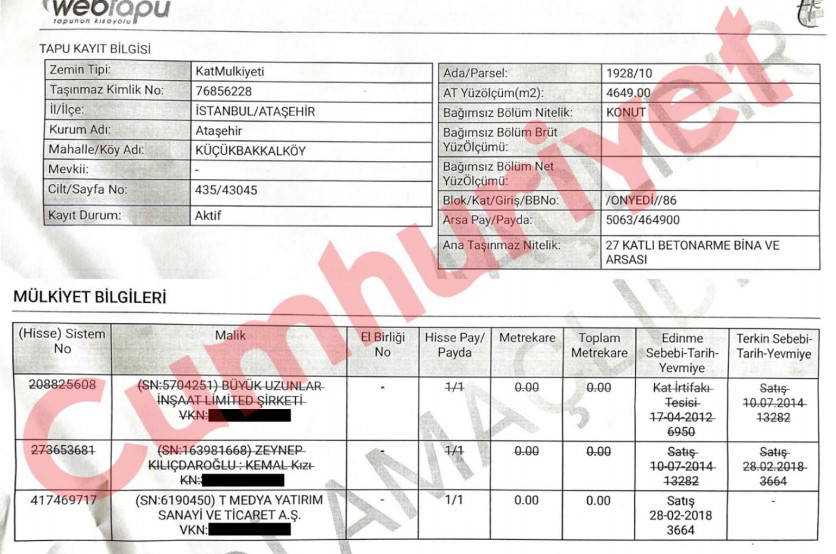 Cumhuriyet, yaklaşık 3 yıl boyunca gündemi meşgul eden ve 3 yıldır da akıbeti bilinmeyen Ataşehir’deki evin tapu kayıtlarına ulaştı. Tapu ve Kadastro Genel Müdürlüğü’nün (TKGM) 2020 sonu kayıtlarına göre; evin mülkiyeti, T Medya Yatırım Sanayi ve Ticaret A.Ş.’de bulunuyor. Akşam, Güneş, Star gazetelerinin yanı sıra Kanal 24 ve Kanal 360’ı bünyesinde bulunduran T Medya’nın, Zeynep Kılıçdaroğlu’ndan devraldığı evi, üçüncü bir kişi ya da kuruma satmadığı görülüyor. Aradan geçen 3 yıl 4 aylık sürede Güneş gazetesinin de “evin satıldığı, elde edilen gelirin şehitlere bağışlandığına” yönelik bir açıklaması bulunmuyor.
