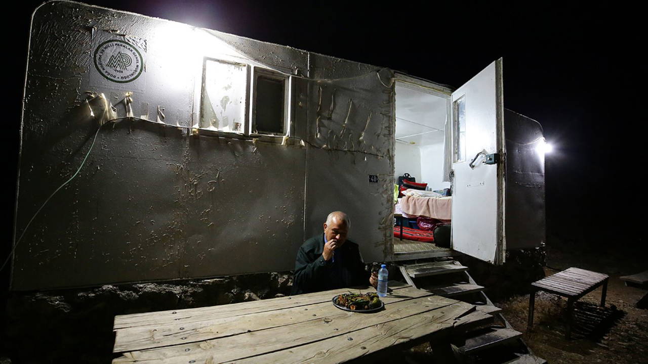 Güneşin doğuş ve batışına şahitlik eden Mente, havanın kararmasıyla da antik kentin yakınlarındaki konteynerde mesaisini tamamlıyor. Burada kendisine eşlik eden radyosuyla küçük mutfakta yemeğini yapan Mente, havanın karanlık olduğu saatlerde zaman zaman devriye atıyor.