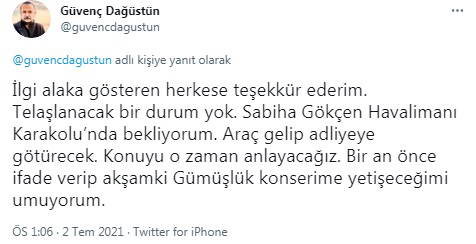 Dağüstün, daha sonra bir paylaşım daha yaparak, "İlgi alaka gösteren herkese teşekkür ederim. Telaşlanacak bir durum yok. Sabiha Gökçen Havalimanı Karakolu’nda bekliyorum. Araç gelip adliyeye götürecek. Konuyu o zaman anlayacağız. Bir an önce ifade verip akşamki Gümüşlük konserime yetişeceğimi umuyorum." açıklaması yaptı.