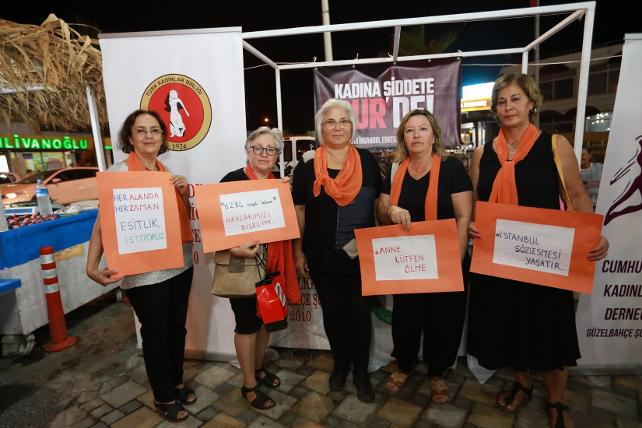Güzelbahçe’de bulanan Güzelbahçe Güçbirliği Bileşenleri olarak bir araya gelen STK’lar bitmeyen kadın cinayetlerinin artık ciddi bir şekilde yasal bir duruma getirilmesini isteyerek şiddet ve cinayetleri protesto etti.