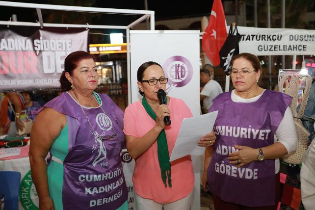 Çocuğunun gözleri önünde öldürülen Emine Bulut ve şiddete kurban giden tüm kadınlar adına konuşma yapan Cumhuriyet Kadınlar Derneği Güzelbahçe Şubesi Başkanı Mesude Öney, “ çocuğunun gözleri önünde ölmek istemediğini haykırarak ölüme giden Emine Bulut’un uğradığı zulmü lanetliyoruz. Kadınların uğradığı şiddet, taciz, tecavüz ve ölüm haberleri yazılı ve görsel medyada her gün yerini alıyor. Yetkili kurumlar açıklama yapıyor ve kadınların ‘ölmek istemiyorum’ haykırışları kulaklarımızda çığlık, vicdanlarımızda yaralar açarak yeni bir habere yer açmak için gerilere itiliyor. Kadınların şiddete uğraması bu şiddetin devamında çocuklarının yakınlarının önünde paramparça olmaları bir sonuçtur. İçinde yaşadığımız ekonomik, siyasal ve kültürel bütünün kadınlara sunduğu bir sonuç. Başka Emine Bulut olayları yaşanmaması için üzerimize düşen görevleri yapmak. Başı darda olan kadınlarımıza destek olmak, sorunlarını birlikte göğüslemek için görev başında olacağız. Tüm yetkilileri de kadını ikinci sınıf sayan eşitsiz, yazısız yasalarla mücadelede sorumluluklarını yerine getirmeye davet ediyoruz” dedi.