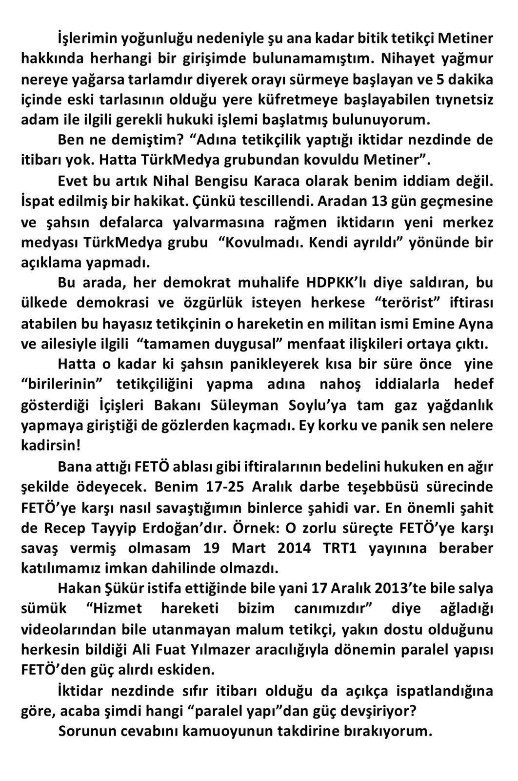 Bugün yeni bir açıklama yayınlayan Nihal Bengisu Karaca, "Ben ne demiştim? Adına tetikçilik yaptığı iktidar nezdinde de itibarı yok. Hatta Türk Medya grubundan kovuldu Metiner. İspat edilmiş bir hakikat. Çünkü tescillendi. Aradan 13 gün geç geçmesine ve şahsın defalarca yalvarmasına rağmen iktidarın yen merkez medyası TürkMedya grubu, 'Kovulmadı. Kendi ayrıldı" yönünde bir açıklama yapmadı" diyerek iddiasının tescillendiğini ifade etti.
