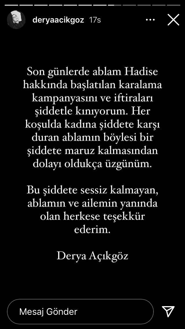 Hadise'nin ardından kız kardeşi Derya Açıkgöz de konuyla ilgili sessizliğini bozdu. Hadise'ye Instagram hesabı üzerinden destek veren Açıkgöz, "Son günlerde ablam Hadise hakkında başlatılan karalama kampanyasını ve iftiraları şiddetle kınıyorum. Her koşulda kadına şiddete karşı duran ablamın böylesi bir şiddete maruz kalmasından dolayı çok üzgünüm. Bu şiddete maruz kalmayan, ablamın ve ailemin yanında olan herkese teşekkür ederim" şeklinde konuştu.
