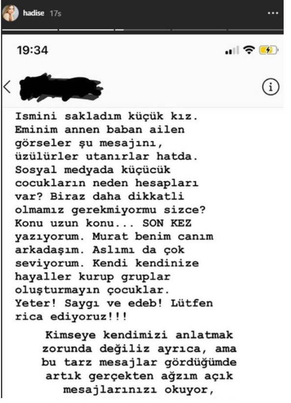 Sosyal medyada yaşı küçük bir kullanıcı Hadise'ye "Senden nefret ediyorum, yeter ya artık Murat ve Aslı'nın arasına girme" şeklinde mesaj attı.