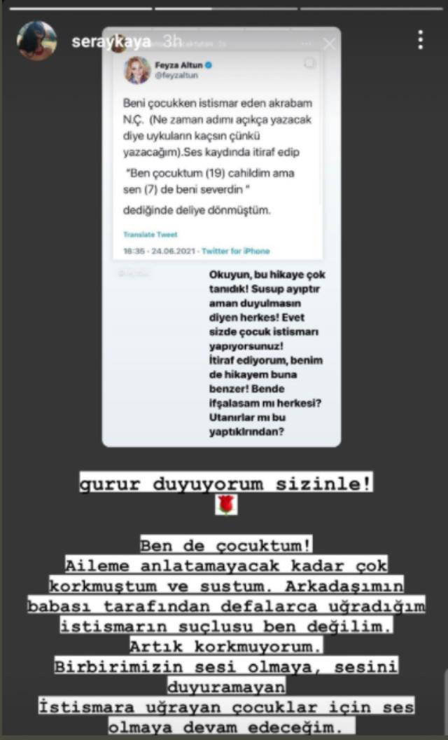 Oyuncu Seray Kaya, sosyal medya hesabından yaptığı paylaşımda, arkadaşının babası tarafından cinsel istismara uğradığını belirterek, şunları söyledi: