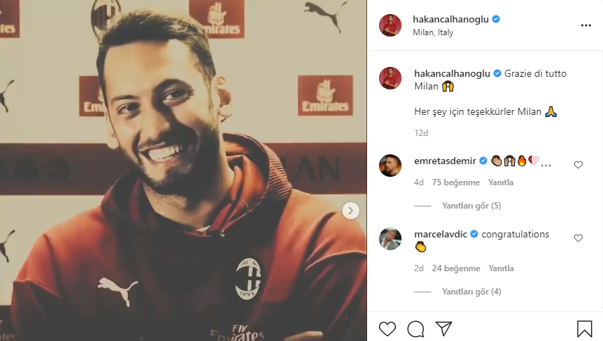 Milan ile sözleşmesi sona eren milli futbolcu Hakan Çalhanoğlu, sosyal medya hesabından yaptığı paylaşım ile takımına veda etti. 27 yaşındaki milli yıldız paylaşımında, "Her şey için teşekkürler Milan" ifadesine yer verdi.