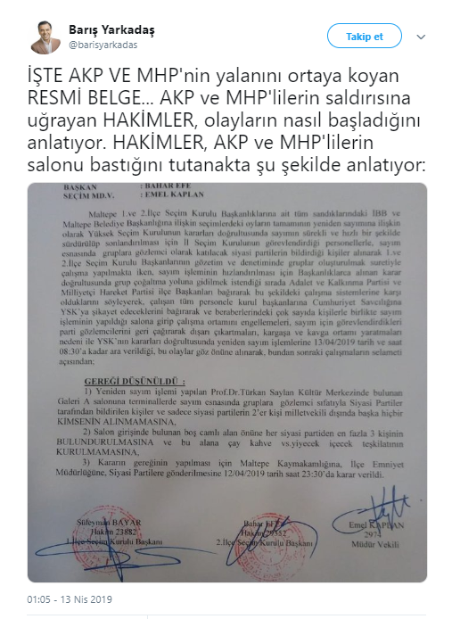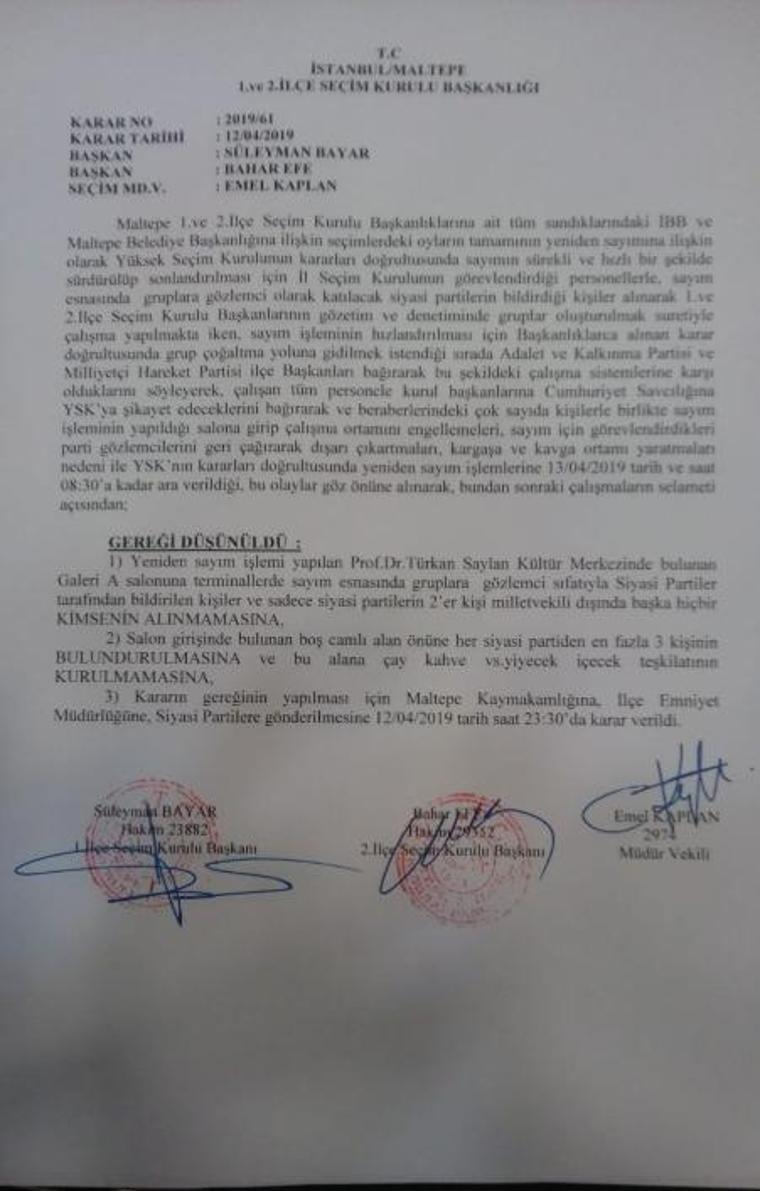 Maltepe İlçe Seçim Kurulu'nun, Sandık Sayım Kurulu sayısını ve sayımı hızlandırmak istemesine tepki gösteren MHP ve AKP'lilerin, sayım alanına topluca girerek çalışmaları durdurduğu ana ait resmi tutanak ortaya çıktı.