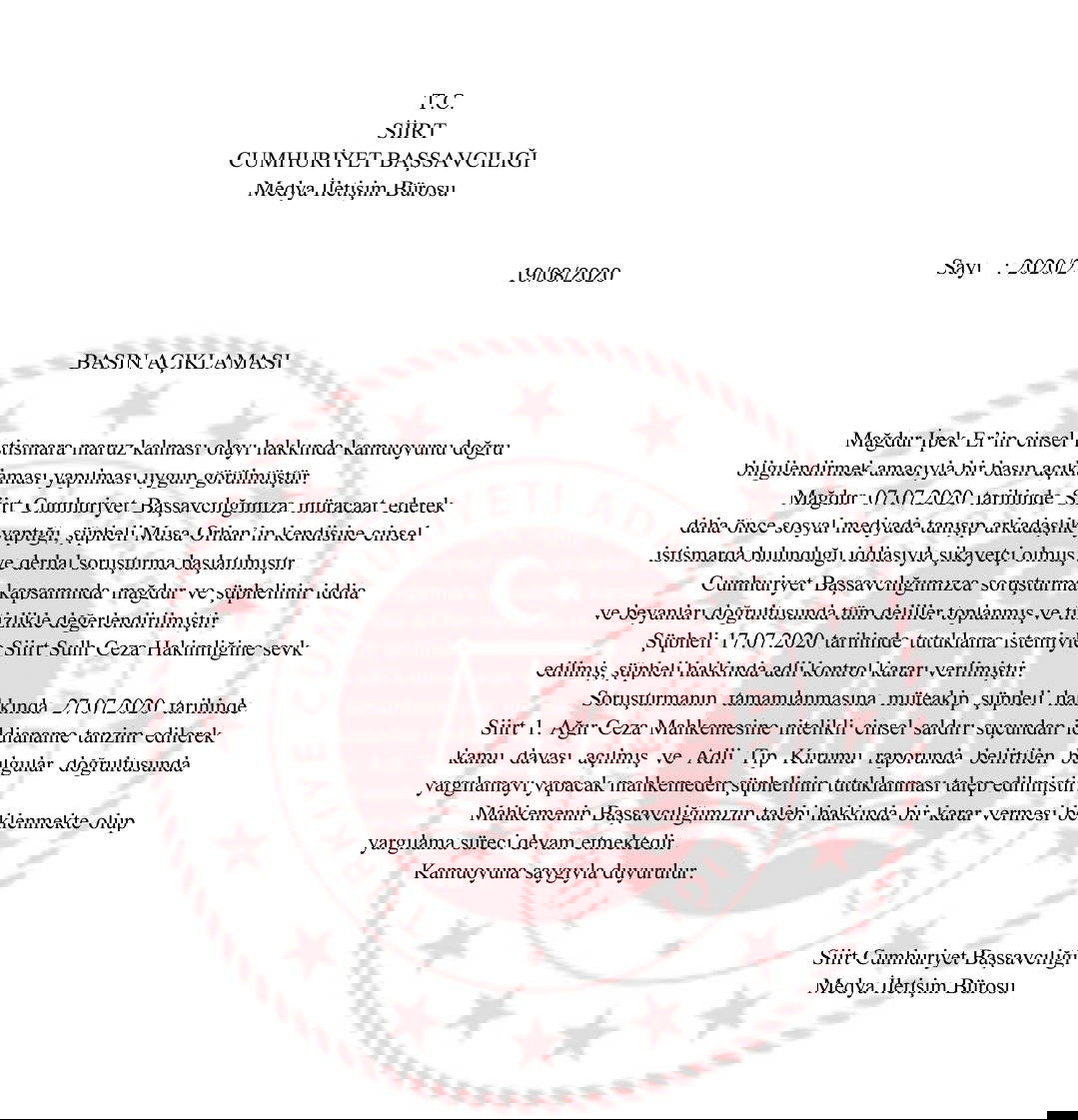 "Mağdur İ. E’in cinsel istismara maruz kalması olayı hakkında kamuoyunu doğru bilgilendirmek amacıyla bir basın açıklaması yapılması uygun görülmüştür. Mağdur 07.07.2020 tarihinde Siirt Cumhuriyet Başsavcılığımıza müracaat ederek daha önce sosyal medyada tanışıp arkadaşlık yaptığı, şüpheli Musa Orhan’ın kendisine cinsel istismarda bulunduğu iddiasıyla şikayetçi olmuş ve derhal soruşturma başlatılmıştır. Cumhuriyet Başsavcılığımızca soruşturma kapsamında mağdur ve şüphelinin iddia ve beyanları doğrultusunda tüm deliller toplanmış ve titizlikle değerlendirilmiştir. şüpheli 17.07.2020 tarihinde tutuklama istemiyle Siirt Sulh Ceza Hakimliğine sevk edilmiş, şüpheli hakkında adli kontrol kararı verilmiştir. Soruşturmanın tamamlanmasına müteakip şüpheli hakkında 27.07.2020 tarihinde Siirt 1. Ağır Ceza Mahkemesine nitelikli cinsel saldırı suçundan iddianame tanzim edilerek kamu davası açılmış ve Adli Tıp Kurumu raporunda belirtilen bulgular doğrultusunda yargılamayı yapacak mahkemeden şüphelinin tutuklanması talep edilmiştir. Mahkemenin Başsavcılığımızın talebi hakkında bir karar vermesi beklenmekte olup yargılama süreci devam etmektedir. Kamuoyuna saygıyla duyurulur"