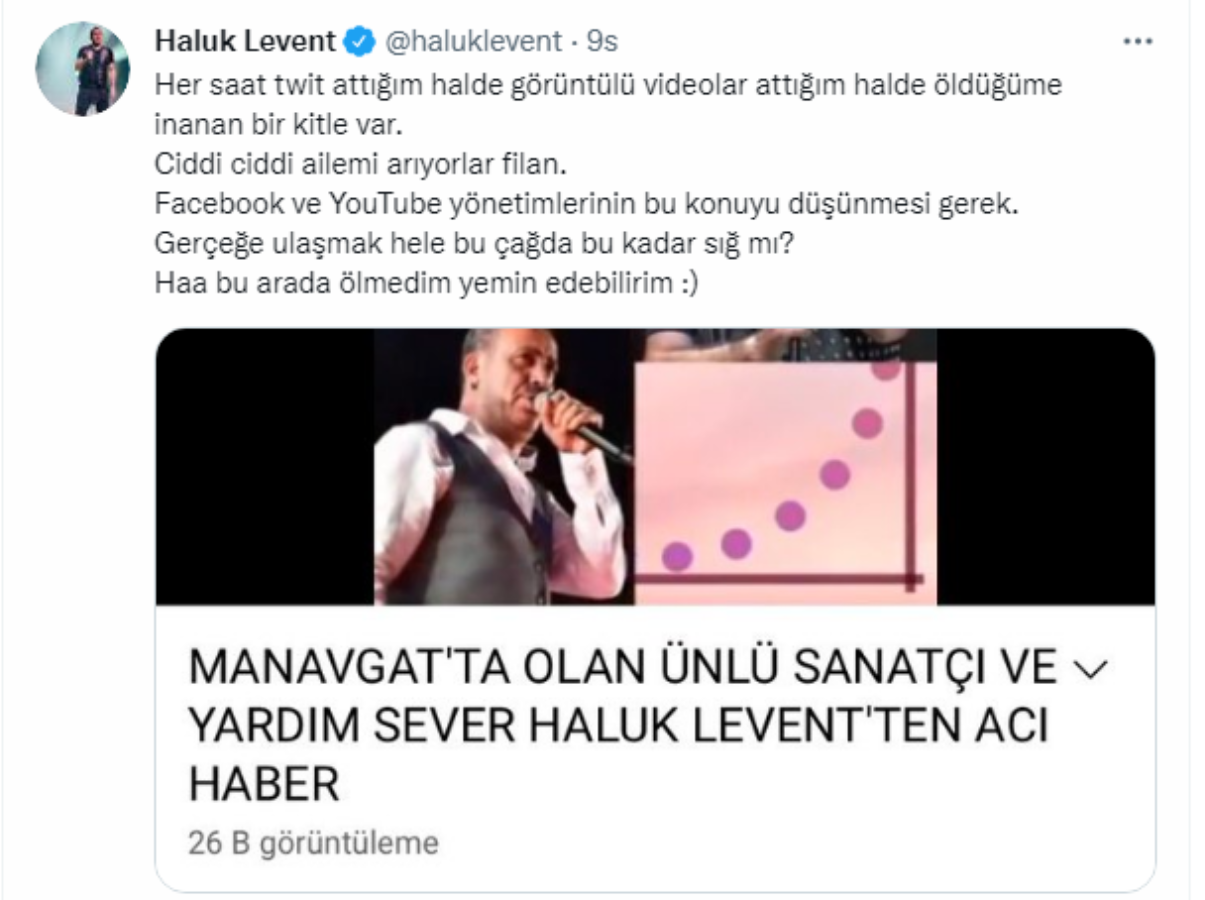 Açıklamasına gerçek dışı haberin fotoğrafını da ekleyen Levent, "Her saat tweet attığım, görüntülü videolar attığım halde öldüğüme inanan bir kitle var. Ciddi ciddi ailemi arıyorlar filan… Facebook ve YouTube yönetimlerinin bu konuyu düşünmesi gerek. Gerçeğe ulaşmak hele bu çağda bu kadar sığ mı? Haa bu arada ölmedim, yemin edebilirim” ifadelerini kullandı.