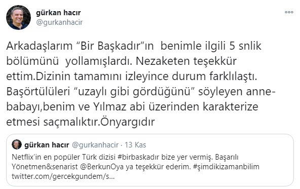Hacır'ın açıklaması şöyle: "Arkadaşlarım 'Bir Başkadır'ın benimle ilgili 5 saniyelik bölümünü yollamışlardı. Nezaketen teşekkür ettim. Dizinin tamamını izleyince durum farklılaştı. Başörtülüleri uzaylı gibi gördüğünü söyleyen anne-babayı benim ve Yılmaz Ağabey üzerinden karakterize etmesi saçmalıktır. Önyargıdır" ifadelerini kullandı.