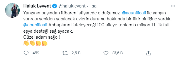 "Yangının başından itibaren istişarede olduğumuz Acun Ilıcalı ile yangın sonrası yeniden yapılacak evlerin durumu hakkında bir fikir birliğine vardık. Acun Ilıcalı, Ahbapların listeleyeceği 100 aileye toplam 5 milyon TLlik ful eşya desteği sağlayacak. Güzel adam sağ ol" dedi.