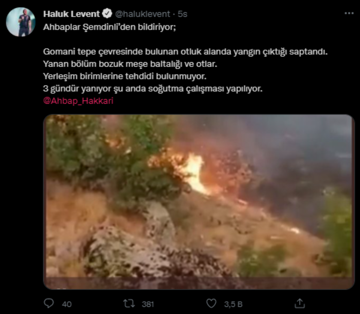 Hakkari Şemdinli'de bulunan Goman Tepe'sinde yangın başladığını duyuran Levent, Twitter'dan yaptığı paylaşımda şu ifadeleri kullanmıştı: