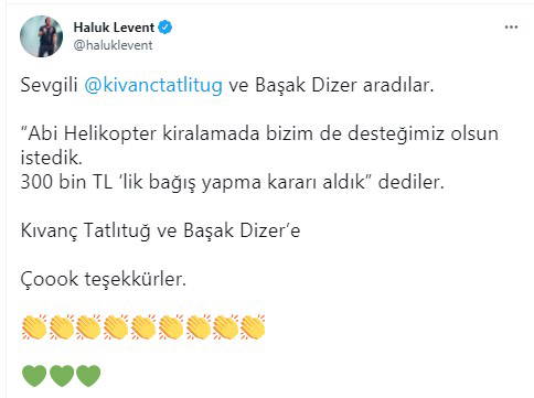 Twitter hesabından Tatlıtuğ ve Dizer'in yardım yapacağını duyuran Haluk Levent, yaptığı paylaşımda şu ifadeleri kullandı;