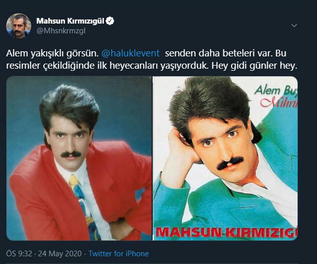Yıllar öncesine ait albüm fotoğraflarını Twitter’dan paylaşan Mahsun Kırmızıgül, "Alem yakışıklı görsün. @haluklevent senden daha beteleri var. Bu resimler çekildiğinde ilk heyecanları yaşıyorduk. Hey gidi günler hey" dedi.