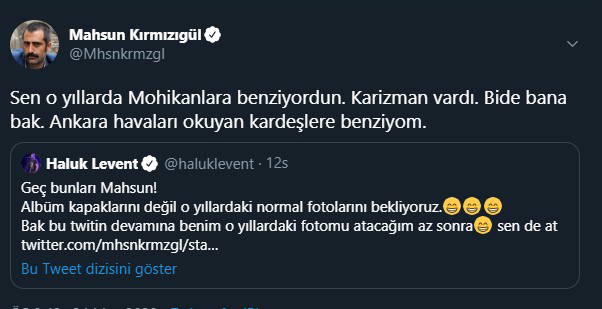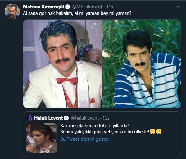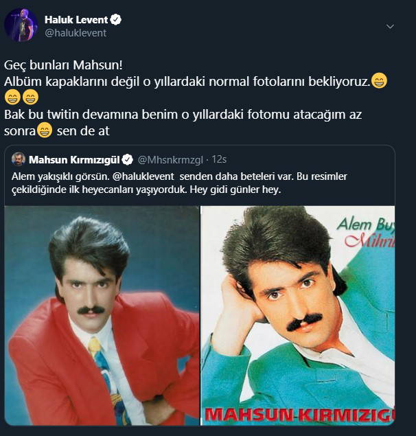 Kırmızıgül’ün bu paylaşımına Levent’ten gelen yanıt ise "Geç bunları Mahsun!’ Albüm kapaklarını değil o yıllardaki normal fotolarını bekliyoruz. Bak bu twitin devamına benim o yıllardaki fotomu atacağım az sonra, sen de at" oldu ve gençlik fotoğrafını koydu.
