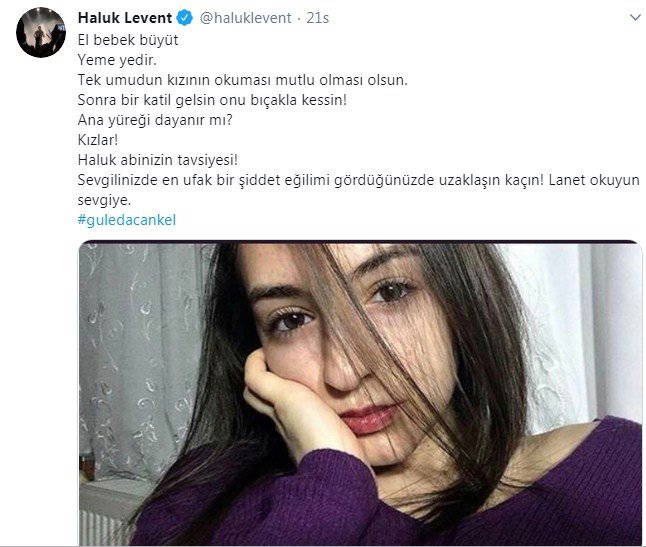 Levent, #guledacankelpaylaşım hashtag’iyle attığı tweet’te, “El bebek büyüt, yeme yedir. Tek umudun kızının okuması, mutlu olması olsun. Sonra bir katil gelsin onu bıçakla kessin! Ana yüreği dayanır mı? Kızlar. Haluk abinizin tavsiyesi. Sevgilinizden en ufak bir şiddet eğilimi gördüğünüzde uzaklaşın kaçın! Lanet okuyun sevgiye” ifadelerini kullandı.