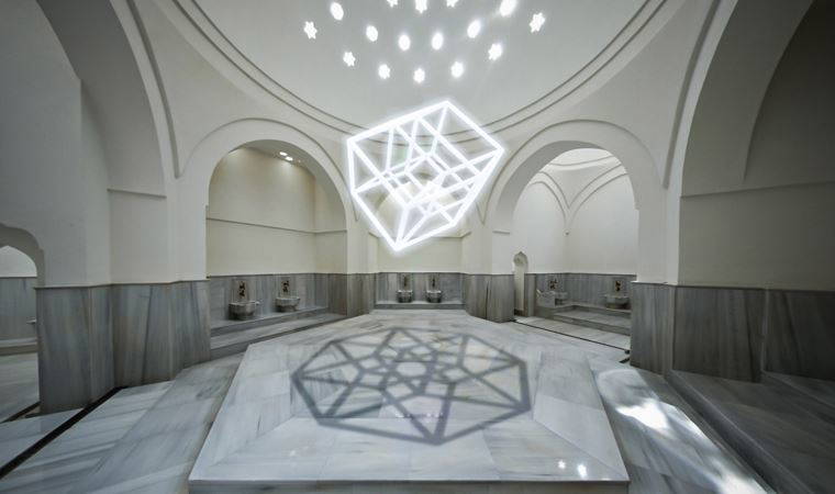Tophane’nin sıra dışı sergi mekânlarından Kılıç Ali Paşa Hamamı, Lizbon’da yaşayan sanatçı Özge Topçu’nun dijital sanat ile mekâna özgü enstalasyonunu bir araya getiriyor. Topçu, 4 boyutlu hiperküpü Kılıç Ali Paşa Hamamı’nda yeniden kurgularken mekânla etkileşime geçiyor ve formun izdüşümlerini ışık ile yeniden dönüştürüyor. Bu form, modern geometride dört boyutlu teseraktın doğurduğu bir yıldız formu olarak öne çıkıyor. Odeabank O’Art, yılın ikinci sergisi “Işıklık/Skylight”ı çevrim içi olarak sanatseverlerle buluşturuyor.