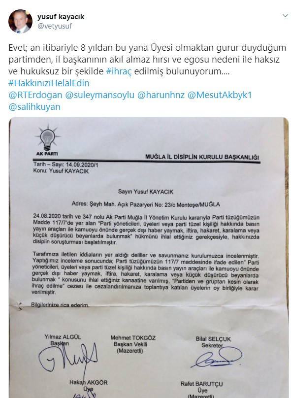Genel Merkez, tpaylaşımı yapan Muğla İl Başkanı ve yönetimi görevden aldı. Kayacak partisi AKP'den de ihraç edildi.