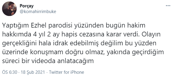 Karar sonrası Twitter hesabından açıklamada bulunan Porçay, “Yaptığım Ezhel parodisi yüzünden bugün hakim hakkımda 4 yıl 2 ay hapis cezasına karar verdi. Olayın gerçekliğini hâlâ idrak edebilmiş değilim bu yüzden üzerinde konuşmam doğru olmaz, yakında geçirdiğim süreci bir videoda anlatacağım” dedi.