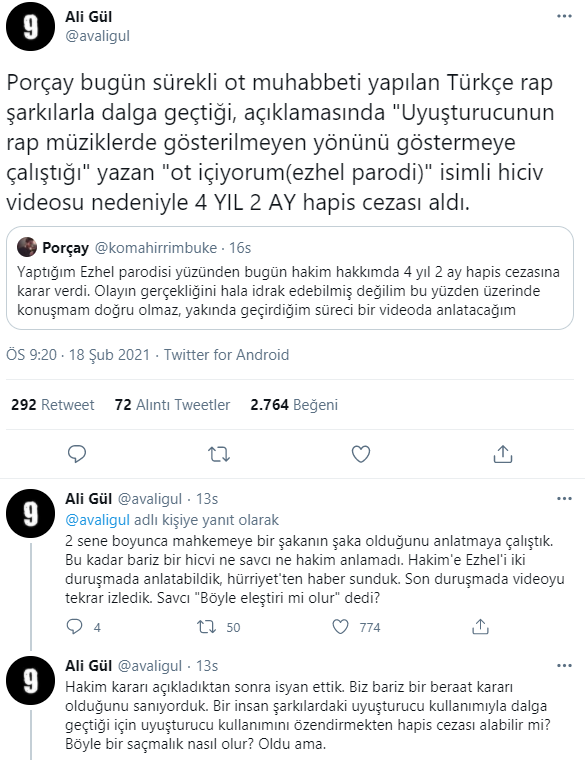 Porçay’ın avukatı Ali Gül ise Twitter hesabından duruşmada hakim ve savcı ile yaşadıkları diyaloğu paylaştı. Ali Gül, “2 sene boyunca mahkemeye bir şakanın şaka olduğunu anlatmaya çalıştık. Bu kadar bariz bir hicvi ne savcı ne hakim anlamadı” dedi.