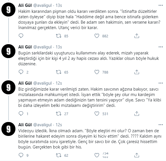 Bugün şarkılardaki uyuşturucu kullanımını alay ederek, mizah yaparak eleştirdiği için bir kişi 4 yıl 2 ay hapis cezası aldı. Yazıklar olsun böyle hukuk düzenine. Biz girdiğimizde karar verilmişti zaten. Hakim savcının ağzına bakıyor, savcı mütalaasında mahkumiyet istedi. İsyan ettik ‘böyle şey olur mu kardeşim yapmayın etmeyin adam dediğinizin tam tersini yapıyor’ diye. Savcı ‘Ya klibi bir daha izleyelim belki mütalaamı değiştiririm’ dedi.