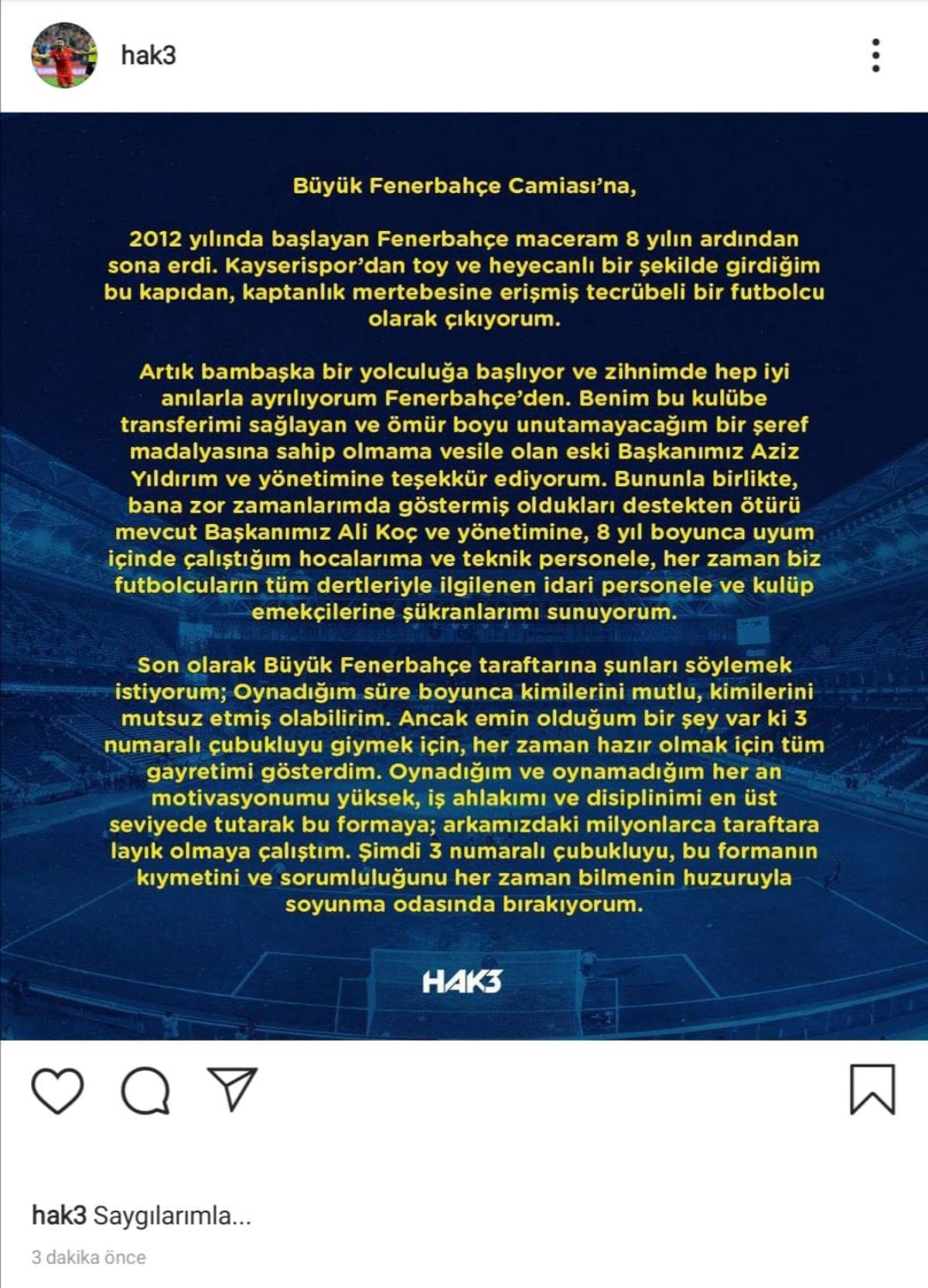 Veda mesajında Fenerbahçe'den iyi anılarla ayrıldığını kaydeden milli sol bek "Benim bu kulübe transferimi sağlayan ve ömür boyu unutmayacağım bir şeref madalyasına sahip olmama vesile olan eski Başkanımız Aziz Yıldırım ve yönetimine teşekkür ediyorum. Bununla birlikte bana zor zamanlarımda göstermiş oldukları destekten ötürü mevcut başkanımız Ali Koç ve yönetimine, 8 yıl boyunca uyum içinde çalıştığım hocalarıma ve teknik personele, her zaman biz futbolcuların tüm dertleriyle ilgilenen idari personele ve kulüp emekçilerine şükranlarımı sunuyorum" ifadelerine verdi.