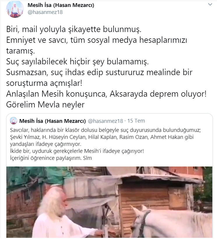 ''Biri, mail yoluyla şikayette bulunmuş. Emniyet ve savcı, tüm sosyal medya hesaplarımızı taramış. Suç sayılabilecek hiçbir şey bulamamış. Susmazsan, suç ihdas edip sustururuz mealinde bir soruşturma açmışlar! Anlaşılan Mesih konuşunca, Aksaray'da deprem oluyor! Görelim Mevla neyler.''