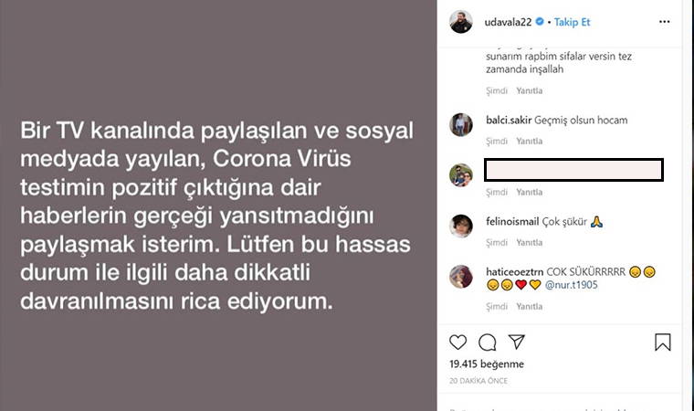 Fatih Terim yaptığı paylaşımda, ''Bugün yapılan test sonuçlarına göre Corona Virüs sonucum pozitif çıkmıştır. Hastanede emin ellerdeyim. Merak etmeyin. En kısa zamanda haberleşmek üzere..." ifadelerini kullandı.