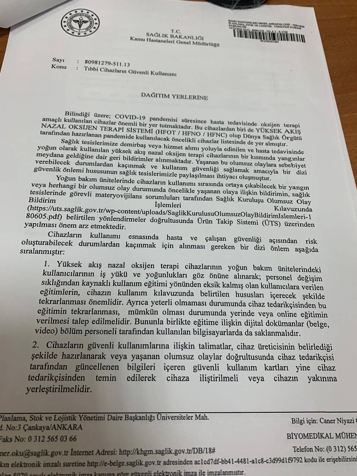 Sözcü'den Erdoğan Süzer'in haberine göre; Covid hastalarının tedavisinde yaygın olarak kullanılan düşük kaliteli oksijen terapi cihazlarının yangın çıkardığı yönünde çok sayıda hastaneden Sağlık Bakanlığı’na bildirim yapıldı, ancak cihazların kullanımına devam edildi.