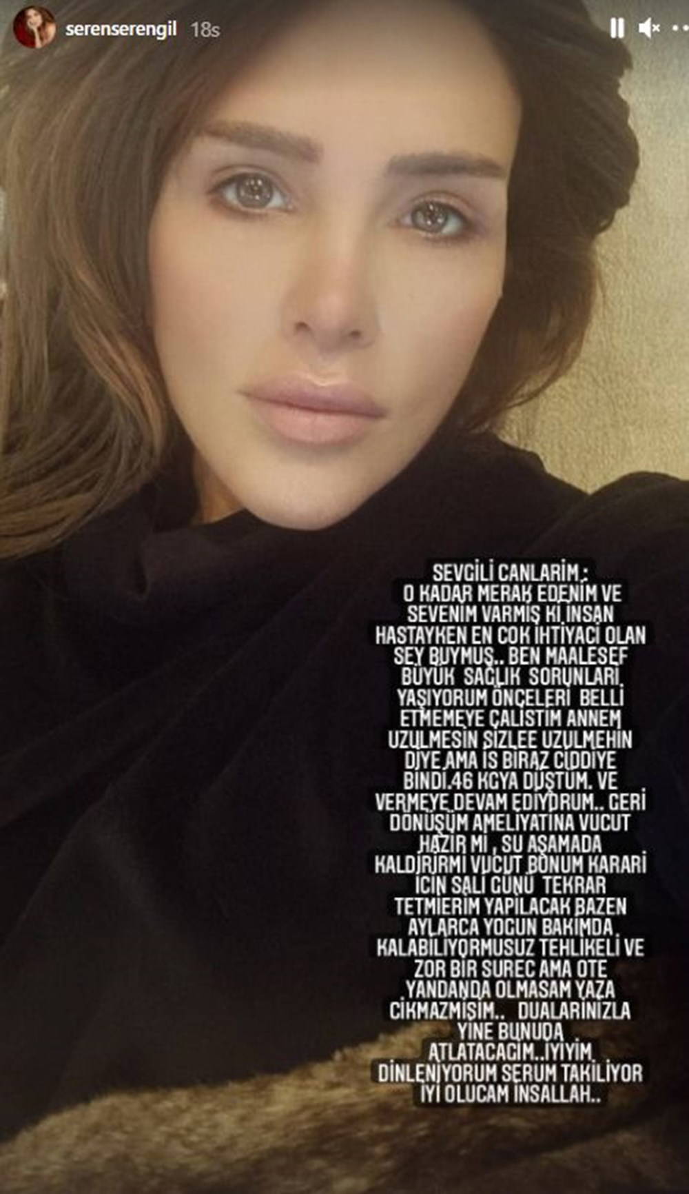 Instagram hesabından açıklama yapan Serengil, "Önceleri belli etmemeye çalıştım annem üzülmesin, sizler üzülmeyin diye ama iş biraz ciddiye bindi. 46 kiloya düştüm" dedi.