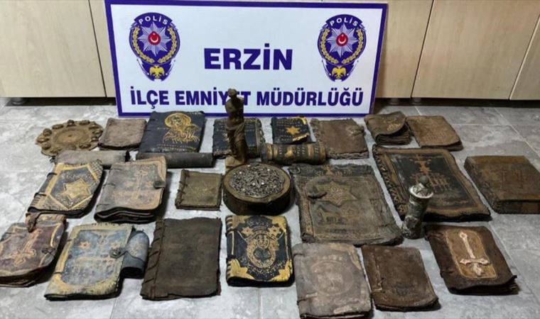 Erzin İlçe Emniyet Müdürlüğü ekipleri, yol kontrolü sırasında durumundan şüphelendikleri aracı durdurdu. Araçta arama yapan ekipler, bagajdaki çantada birer heykel ve porselen ile eski deri üzerinde çeşitli dillerde yazı, sembol ve motifler bulunan 25 kitap ele geçirdi.