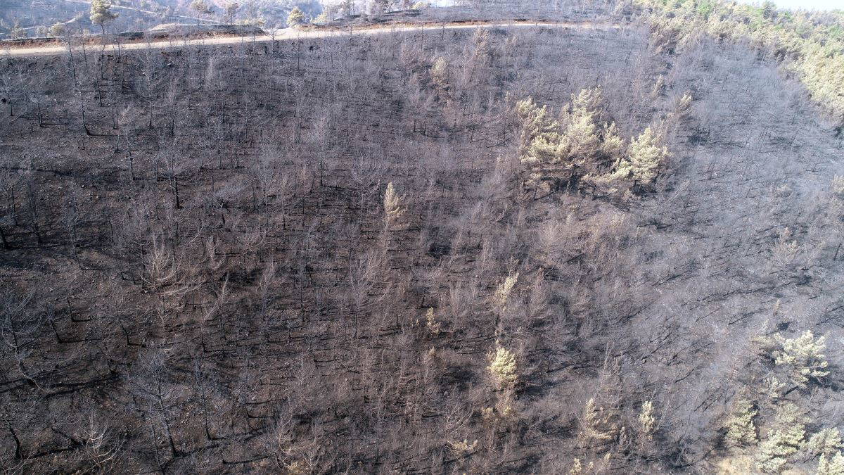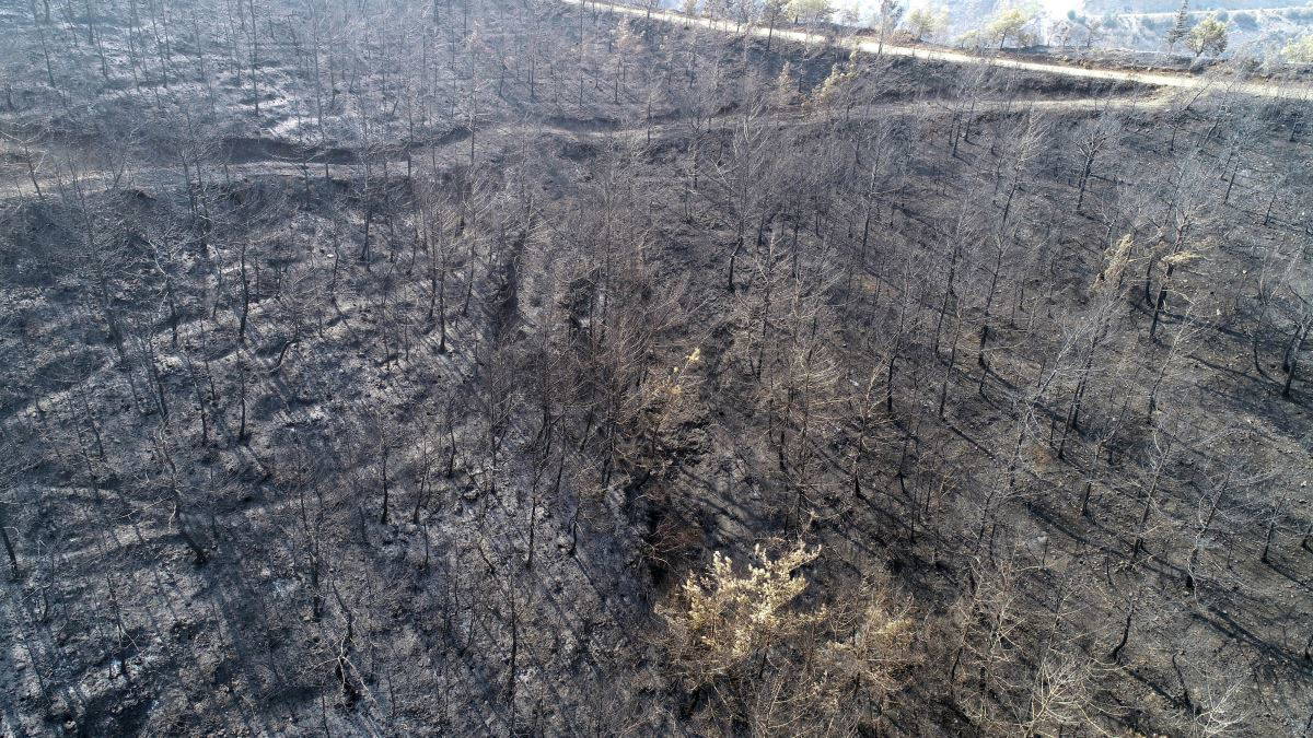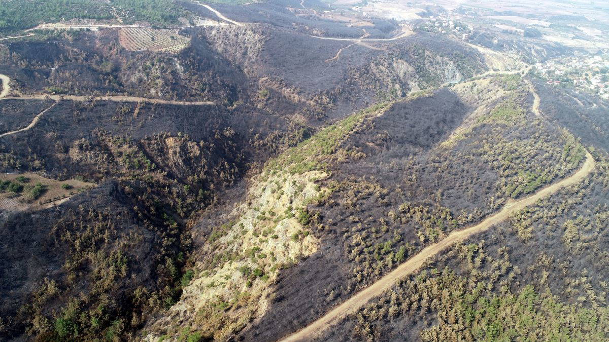 Soğutma çalışmalarının sürdüğü bölgede, yanan ormanlık alanlar, havadan görüntülendi.