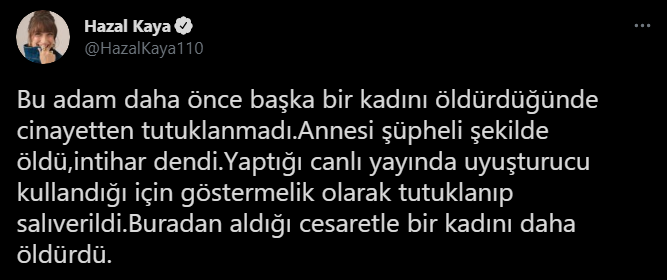 Oyuncu Hazal Kaya, Aleyna Çakır cinayetinin baş şüphelisi olan ve bu kez de bir başka genç kadının ölümüyle ilgili gözaltına alınan Ümitcan Uygun'a ve sosyal medya üzerinden tepki gösterdi.