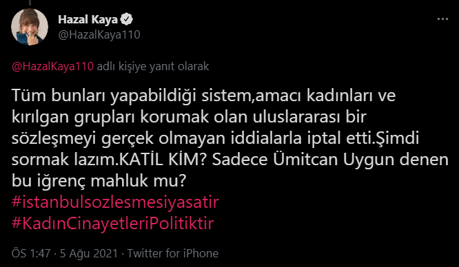 Tüm bunları yapabildiği sistem, amacı kadınları ve kırılgan grupları korumak olan uluslararası bir sözleşmeyi gerçek olmayan iddialarla iptal etti. Şimdi sormak lazım. KATİL KİM? Sadece Ümitcan Uygun denen bu iğrenç mahluk mu?"