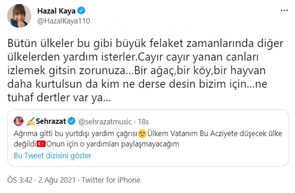Kaya, “Bütün ülkeler bu gibi büyük felaket zamanlarında diğer ülkelerden yardım isterler. Cayır cayır yanan canları izlemek gitsin zorunuza…Bir ağaç, bir köy, bir hayvan daha kurtulsun da kim ne derse desin bizim için…ne tuhaf dertler var ya…” ifadelerini kullandı.