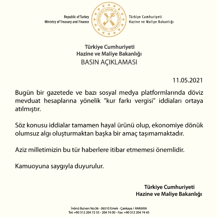 "Bugün bir gazetede ve bazı sosyal medya platformlarında döviz mevduat hesaplarına yönelik 'kur farkı vergisi' iddiaları ortaya atılmıştır." ifadelerini kullanan Hazine ve Maliye Bakanlığı, "Söz konusu iddialar tamamen hayal ürünü olup, ekonomiye dönük olumsuz algı oluşturmaktan başka bir amaç taşımamaktadır" açıklamasına yer verildi.