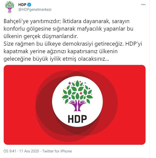 HDP'nin açıklamasında, "Bahçeli’ye yanıtımızdır; İktidara dayanarak, sarayın konforlu gölgesine sığınarak mafyacılık yapanlar bu ülkenin gerçek düşmanlarıdır. Size rağmen bu ülkeye demokrasiyi getireceğiz" ifadeleri de kullanıldı.