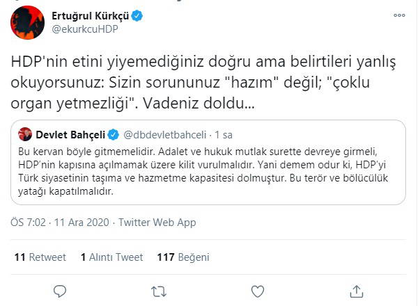 Bahçeli yaptığı açıklamada, "HDP’nin kapısına açılmamak üzere kilit vurulmalıdır. Yani demem odur ki, HDP’yi Türk siyasetinin taşıma ve hazmetme kapasitesi dolmuştur. Bu terör ve bölücülük yatağı kapatılmalıdır" ifadelerini kullandı. Bahçeli'ye, "Vadeniz doldu" diyen Kürkçü, şu açıklamalarla yanıt verdi: