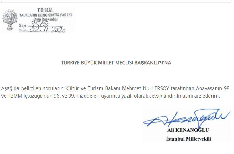 “Aşağıda belirtilen soruların Kültür ve Turizm Bakanı Mehmet Nuri ERSOY tarafından Anayasanın 98. ve TBMM İçtüzüğü’nün 96. ve 99. maddeleri uyarınca yazılı olarak cevaplandırılmasını arz ederim.