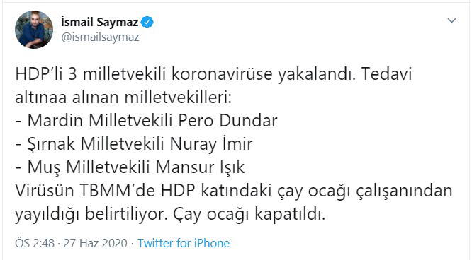 Öte yandan gazeteci İsmail Saymaz, kişisel Twitter hesabından yaptığı paylaşımla Covid-19 testi pozitif çıkan milletvekillerinin isimlerini paylaştı. Saymaz'ın iddiasına göre, koronavirüse yakalanan ve tedavi altına alınan HDP'li vekiller şu şekilde: