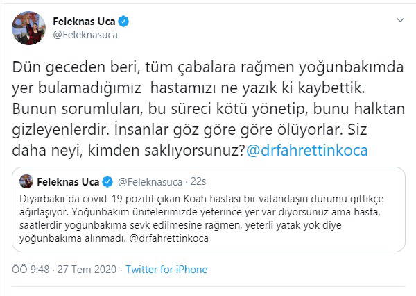 Sağlık Bakanı Fahrettin Koca'yı etiketleyerek bir koronavirüs hasatsının yoğun bakıma sevk edilmesine rağmen yer olmadığı için yoğun bakıma alınmadığını söyleyen Feleknas Uca, daha sonra yaptığı bir paylaşımla aynı zamanda KOAH hastası da olan yurttaşın yaşamını yitirdiğini söyledi.