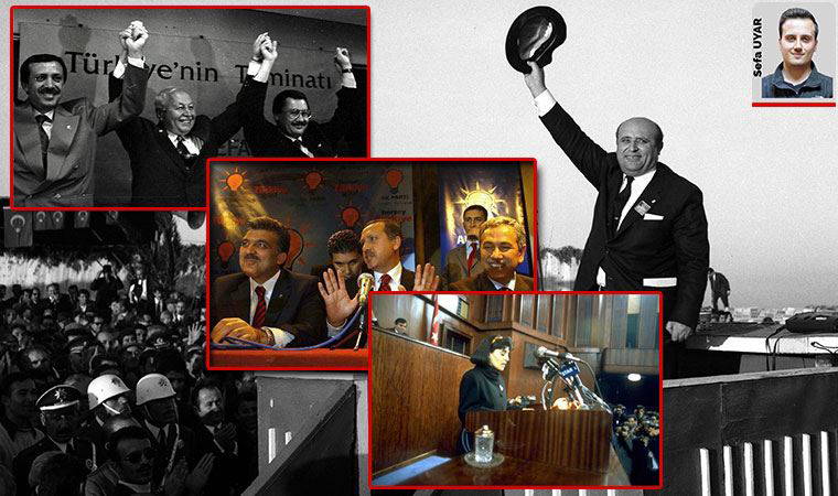 Partilerinin kapatılmasına karşın farklı siyasi partiler kuran bir çizgi de Milli Görüş çizgisi. Necmettin Erbakan liderliğinde kurulan ve “laikliğe aykırı eylemleri” nedeniyle 1971’de kapatılan Milli Nizam Partisi’nin mirasçısı, 1972’de açılan Milli Selamet Partisi oldu. Kurulduktan bir yıl sonraki genel seçimlere katılan MSP, yüzde 11’lik oy oranı ile 48 milletvekili çıkardı ve 1974’teki koalisyonun ortağı oldu. 1977 genel seçimlerinde oy oranı yüzde 8.6’a düşen MSP, 1980’de “laikliğe aykırı eylemler” gerekçesi ile kapatıldı. Milli Görüş çizgisi, 1983’te kurulan Refah Partisi (RP) adıyla siyasete devam etti. Kurulduktan sonraki ilk seçimlere katılamayan RP, 1986’daki ara seçimlere katıldı ancak oy oranı yüzde 4.76’da kaldı. 1994’teki yerel seçimlerde İstanbul ve Ankara belediye başkanlıklarını kazanan, 1995 genel seçimlerinde ise yüzde 21.38 oy ile sandıktan birinci çıkan RP, 1998’de “laikliğe aykırı eylemleri” nedeniyle kapatıldı.