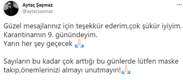 Şaşmaz, paylaşımında "Güzel mesajlarınız için teşekkür ederim, çok şükür iyiyim. Karantinamın 9. günündeyim. Yarın her şey geçecek. Sayıların bu kadar çok arttığı bu günlerde lütfen maske takıp, önlemlerinizi almayı unutmayın" ifadelerini kullandı.