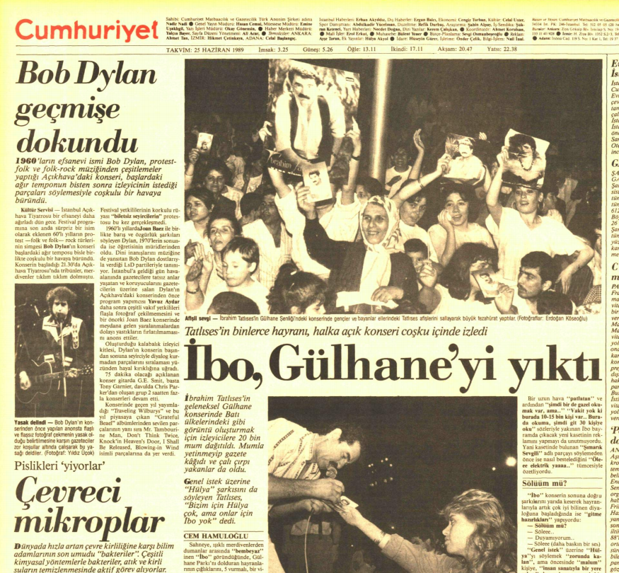 İKSV Genel Müdürü ve Bob Dylan’ın her iki konserinin de mimarı Görgün Taner, üstadın 80. yaşgünü için sosyal medyada gazetemizin 1989 tarihli bir sayfasını paylaştı ve o ilk konserin yankılarını andı. Kendisine telefonla ulaştık ve hikayenin detaylarını dinledik. Diyor ki Görgün Taner: “Aslında o sayfa her şeyi anlatıyor… Bir tarafta Bob Dylan konserinin haberi, bir tarafta da İbrahim Tatlıses’inki. Ertesi gün dönüş yolunda Bob Dylan basında çıkan haberleri sordu bize, biz de Cumhuriyet’i gösterdik. Dylan sayfayı görünce ‘Bu kim ya, benden daha meşhur’ diye sordu. Biz de anlattık işte İbrahim Tatlıses’in Türtkiye’de ne kadar meşhur olduğunu. “Kaç kişi geldi onun konserine’ diye sordu; 50 bin dedik. ‘Ben niye onun konser verdiği yerde vermedim o zaman?’ dedi, biz de işte gelecek sefer falan diye geçiştirdik. Nereden bilecek adam Gülhane parkını, oradaki atmosferi. ‘Peki’ dedi en son, ‘nasıl müzik yapıyor, Blues mu?’ dedi, ‘Hah, dedik, evet Turkish Blues’.”