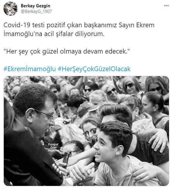 Sosyal medya hesabından paylaşım yapan Berkay Gezgin mesajında; 'Covid-19 testi pozitif çıkan başkanımız Sayın Ekrem İmamoğlu'na acil şifalar diliyorum. "Her şey çok güzel olmaya devam edecek.' ifadelerini kullandı.
