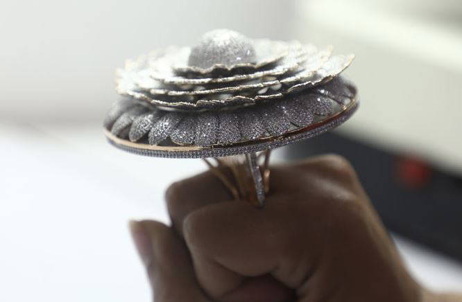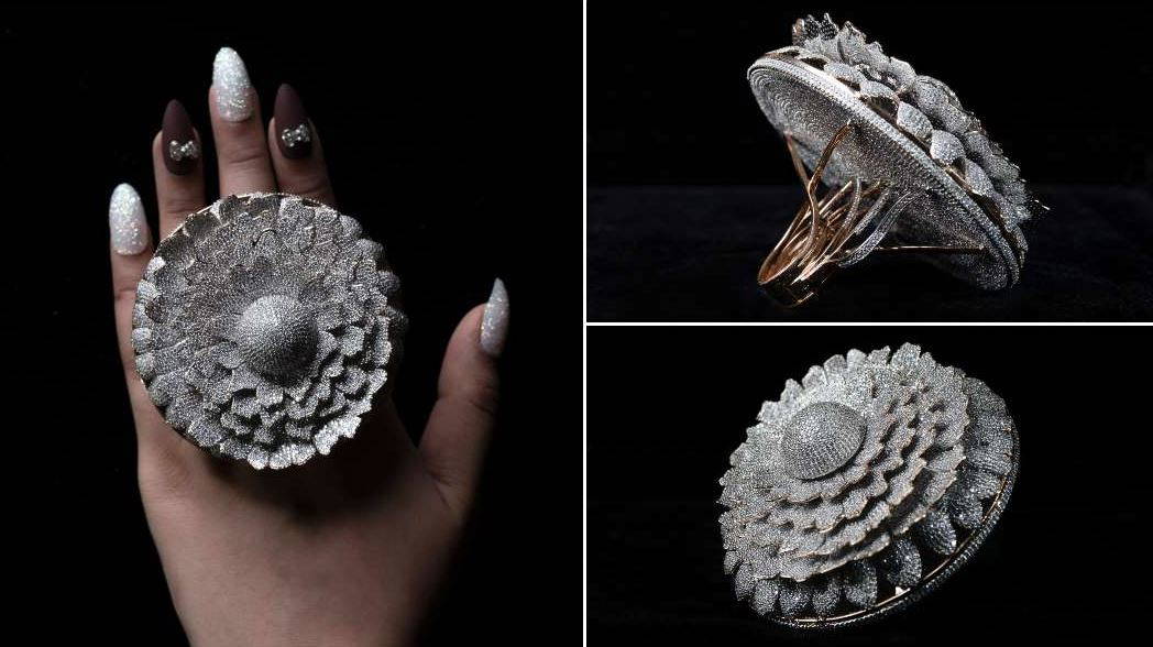 Guinness’e göre, ‘Marigold’ (kadife çiçeği) ya da ‘Refah Yüzüğü’ olarak adlandırılan yüzük, binlerce 38.08 karat doğal elmasla bezenmiş, süslü bir çiçek tasarımıyla dairesel bir şekle sahip.